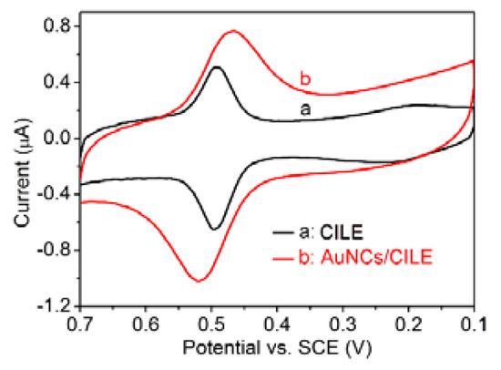 To investigate the electrochemical behavior of luteolin on AuNCs/CILE, we carried out CV to record the cyclic voltammogram of 1.0 µM luteolin on AuNCs/CILE. As shown in Figure 3, a pair of well-defined redox peaks could be obtained on AuNCs/CILE (curve b) for the luteolin solution. The cathodic and anodic peak currents were measured to be Ipc = 0.4688 μA and Ipa = 0.7076 μA, respectively. The results indicate that the redox reaction of luteolin had taken place on AuNCs/CILE, which was in line with the electrochemical reaction mechanism of luteolin on electrodes [4,5]. For comparison, we also recorded the cyclic voltammogram of 1.0 µM luteolin on CILE under the same conditions, and the corresponding anodic and cathodic peak currents were Ipc = 0.3054 μA and Ipa = 0.5145 μA, respectively (curve a in Figure 3). The redox peak currents of luteolin on AuNCs/CILE were about 1.5-fold higher than those on CILE, indicating the superiority of AuNCs/CILE. The reason could be that AuNCs have good conductivity and a hollow and porous nanostructure, which could increase the active surface area of the electrode and improve the electron transfer kinetics. By using the oxidation peak currents as the detection signal, an electrochemical sensing platform for the determination of luteolin could be provided. However, the peak-to-peak separation (ΔEp) of luteolin on CILE was 3.0 mV, which was smaller than that of AuNCs/CILE (55.0 mV). The results may be due to the porous AuNCs with a large surface area, which exhibited certain adsorption activity and decreased the diffusional rate of luteolin from solution to electrode.