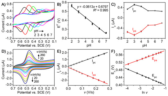 To gain more insight into the electrochemical behavior of luteolin on AuNCs/CILE, we also conducted a set of experiments to study the influence of buffer pH and scan rate on cyclic voltammogram of luteolin on the electrode. Figure 4A shows the cyclic voltammetric responses of 1.0 µM luteolin on AuNCs/CILE in the pH range of 2.0~7.0. By plotting the formal potentials (E0′) and the redox peak currents (Ip) against buffer pH values, the relationship between E0′ and pH (Figure 4B) and Ip and pH (Figure 4C) could be obtained, respectively. It can be found that the redox peak potential shifted negatively as the buffer pH increased from 2.0 to 7.0, suggesting the participation of protons in the electrode reaction process (Figure 4A,B). More importantly, a linear dependence between the E0′ and pH was obtained with a slope value of −61.3 mV/pH that was close to the theoretical value of −59 mV/pH, indicating that the redox reaction of luteolin on the electrode involves an equal number of electron and proton transfers (Figure 4B) [29]. In addition, the Ip value increased rapidly with the increase of pH from 2.0 to 3.0 and decreased gradually after pH = 3, revealing that the electrode reaction could more easily proceedin the acidic solution with more protons (Figure 4C). The maximum Ip value appeared at pH = 3.0 and, thus, pH 3.0 was used as the optimal pH in the following experiments.