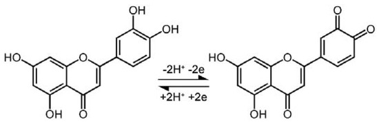 Figure 4D shows the cyclic voltammetric responses of 1.0 µM luteolin on AuNCs/CILE at various scan rates ranging from 20 to 260 mV/s. An increase in the scan rate resulted in a gradual increase in the redox peak currents, together with a positive shift of the anodic peak and a negative shift of the cathodic peak. By plotting the redox peak currents (Ip) against the scan rates (v), two good linear relationships between Ip and v were observed with the regression equations of Ipa (µA) = −8.41v (V/s) − 0.136 (R2 = 0.996) and Ipc (µA) = 7.12v (V/s) + 0.0312 (R2 = 0.999), indicating an adsorption-controlled electrode reaction process (Figure 4E). Furthermore, the plots between the redox peak potentials (E) and the natural logarithm of scan rates (lnv) also exhibited two good linear relationships with the regression equations of Epa (V) = 0.0243lnv + 0.608 (R2 = 0.998) and Epc (V) = −0.0282lnv + 0.373 (R2 = 0.999). According to Laviron’ smodel, the slopes of the equations for Epa − lnv and Epc − lnv can be expressed as RT/(1 − α)nF and −RT/αnF, respectively. Note that R represents the gas constant, α is the electron transfer coefficient, n is the electron transfer number, and F is Faraday’s constant [30]. The values of α and n were calculated to be 0.463 and 1.97, respectively. Therefore, the number of electrons involved in the redox reaction of luteolin on AuNCs/CILE was found to be 2. All the above results demonstrate that the electrochemistry of luteolin on AuNCs/CILE was a two-proton two-electron process with the reaction mechanism shown in Figure 5.