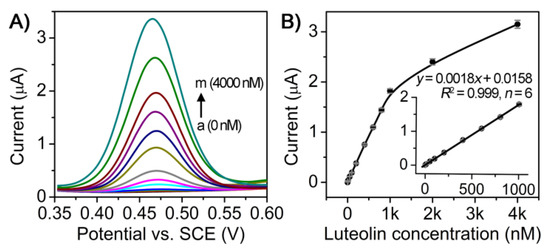 Luteolin (3′,4′,5,7-tetrahydroxyflavone) is an important flavonoid that is naturally present in a variety of plants, e.g., peppermint, green pepper, thyme, and parsley [1,2,3]. In clinical applications, luteolin can be used as a drug to treat many diseases (e.g., respiratory disease, cardiovascular disease, and hyperlipidemia). This is because it has unique biological functions and pharmacological activities, e.g., anti-inflammatory, anti-allergic, anti-ulcer, and anti-oxidation effects, anti-cancer and anti-viral activities, cardiovascular protection, and cataract prevention [4,5,6,7,8]. Moreover, recent studies have demonstrated that luteolin can enter the cell nucleus and suppress oxidative damage of deoxyribonucleic acid [9]. Consequently, the detection and monitoring of luteolin in pharmaceuticals and biological fluids is of great importance for drug quality control, clinical medicine research, and biochemical study.