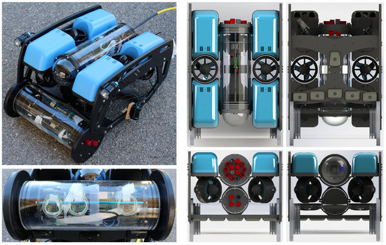 Overall, we provide a complete hardware and software solution for the problem through the conception and realization of a stereo embedded system dedicated to underwater imaging. Two configurations are considered: first, a handheld system to be used by a diver (see Figure 1), and second, a system attached to a customizable Remotely Operated underwater Vehicle (ROV) from BlueRobotics [2] (see Figure 2). Both configurations share similar main architecture (all provided details are for both configurations unless otherwise stated). The system, equipped with two high definition cameras (three cameras in the ROV-attached configuration), can take and store hardware synchronized stereo images while having long-term autonomy. In contrast to other commercially available off-the-shelf products where the system’s role ends with image storage, the designed system is based on distributed embedded systems with ARM processors and a Linux operating system and is capable of running most image processing techniques smoothly in real-time. The available optimized open source libraries, such as OpenCV [3] and OpenCL [4], allow straightforward extension of the provided functions and full customization of the system to suit different contexts.