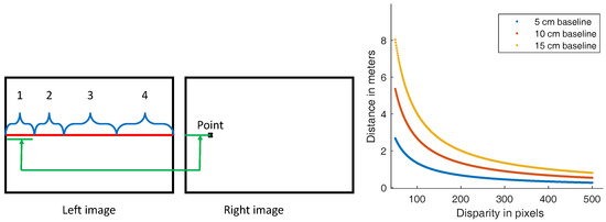 Illustration of stereo disparity ranges (left): (1) impossible due to stereo constraint; (2) impossible in deep underwater imaging due to light fading at far distances; (3) possible disparity; (4) the point is very close, so it becomes overexposed, undetectable, or out of focus. At (right), the disparity evaluation in pixels as a function of distance (in meters) to the camera for the 3 available baseline distances.