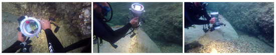 A cylindrical enclosure (34 × 15 cm) is attached to the front side of the ROV, as shown in Figure 2. It hosts the designed trifocal system, which is composed of three RPi computers; each is connected to one camera module (Sony IMX219 8M Pixel CMOS Image Sensor, 3 mm focal length, f/2 aperture). Using the trifocal system allows three stereo pairs with different baseline distances (set to 5, 10 and 15 cm in our implementation) to be present, which helps to handle image acquisition at different distances. Figure 3 (right) shows the range of each baseline distance. Here, we can deduce that a short baseline is preferred in close-range image acquisition. For instance, with the used configurations, it is difficult to get closer than 80, 53 and 26 cm to the scene using 15, 10 and 5 cm baseline distances, respectively. From another perspective, small baseline distances are less accurate for larger distances. We note here that the visibility limit underwater (≈5 m using our lighting system) is much smaller than the stereo range whatever the used baseline distance. The cameras are synchronized using a hardware trigger connected to the general-purpose input/output (GPIO) interface of the RPi computers. The latter are finally connected to an Ethernet switch that is connected to the surface computer. Figure 4 shows the ROV-attached trifocal system in action.