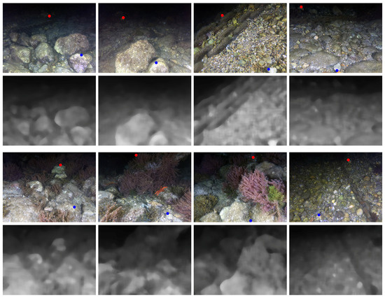 Examples of underwater images taken with our system and the computed rough depth using only the luminance channel. The rough depth was used later to speed up the stereo matching procedure. The red dots show the minimum detectable disparity (≈130 pixels in 10 cm baseline setup), while the blue dots show the maximum disparity (≈450 pixels in 10 cm baseline setup). See Figure 3 for corresponding distances and conversion to other baselines.