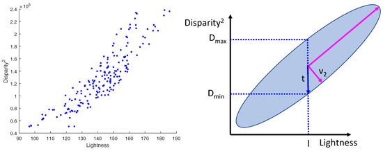 In addition to finding the linear relationship between both variables, it was also necessary to capture the covariance that represents how rough our approximation is. More specifically, given the relation shown in Figure 7, we aim to define a tolerance, t, associated with the disparity as a function of the lightness, l. In our method, we rely on the Principal Component Analysis (PCA) technique to obtain this information. In detail, for a given lightness, l, we first compute the corresponding squared disparity, , using a linear regression approach as follows: