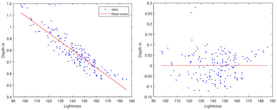 Lightness vs. true depth relationship for a subset of matched points (the same as that used in Figure 7). Left: local average pixel lightness vs. true depth (10 cm baseline); the red line represents the lightness to depth transformation—it is deduced from Equation (2). Right: the residuals of the depth estimation from lightness vs. true depth.