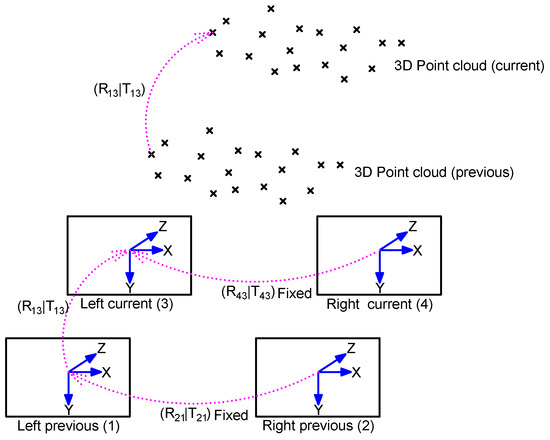 An initial ego-motion is calculated every time a new image pair is captured. Let denote the previous left, previous right, current left, and current right frames, respectively (see Figure 9 for illustration). We consider here that the relative positions of the previous left frame to the current left frame () represent the system motion. The pipeline of the ego-motion estimation proceeds is as follows: