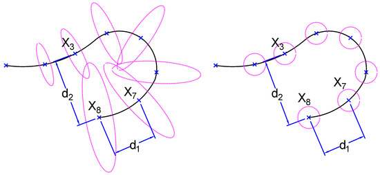 Example of a trajectory with uncertainty modeled by the full covariance matrix (left). The distance, , is statistically estimated to be smaller than . In contrast, it is the inverse when the noise is modeled with equal variances (right).