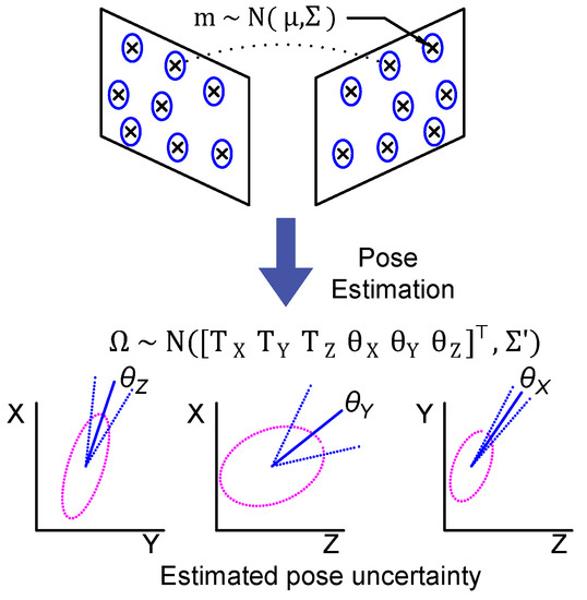 where is the element at row i and column j of . To show the estimated pose error distribution, we consider one configuration example, the identity camera intrinsic matrix, . Let us now take the case of pure translational motion between the two camera frames, , and , where and are the translation and rotation vectors respectively. The fundamental matrix, in this case, is given as a skew-symmetric matrix of , denoted . In this case, Equation (12) is simplified to