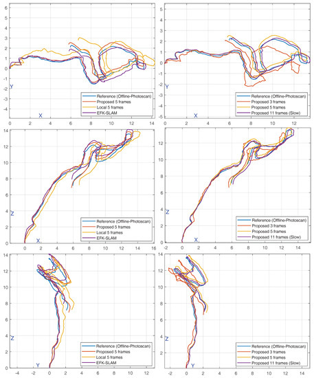 Comparison of trajectory estimation using several methods and parameters. The trajectory obtained using Agisoft Photoscan was considered a reference. It was compared to our method, local optimization using 5 frames, and EFK-SLAM [50] (left column). It was also compared to our method in cases where 3, 5, or 11 frames were used for optimization (right column). All units are in meters.
