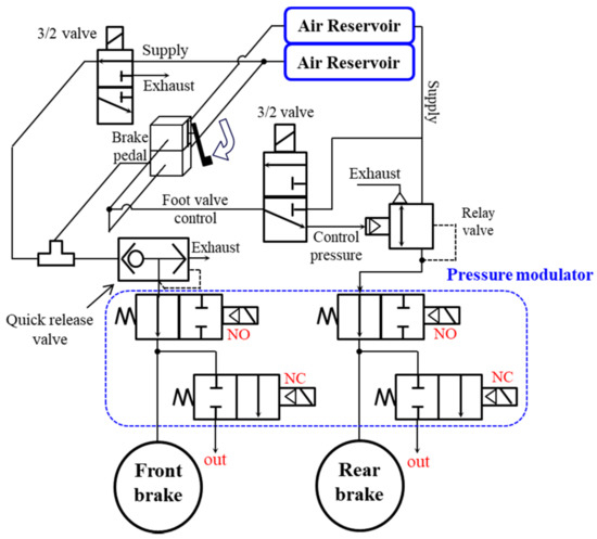 - Miller, J.I.; Cebon, D. A high performance pneumatic braking system for heavy vehicles. Veh. Syst. Dyn. 2010, 48, 373–392. [Google Scholar] [CrossRef]