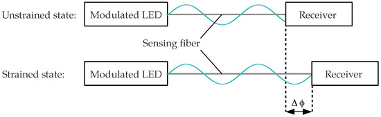 We have proposed an optical strain sensor based on the phase measurement of an intensity-modulated light wave using an SI-POF instead [16,17]. The sensor scheme is simple and competitive. An LED can be used as the light source and an optical receiver is required to convert the intensity-modulated optical power at the end of the fiber into a modulated electrical voltage. When the fiber is strained, the modulation phase at the end of the fiber changes, resulting in a phase shift , as depicted in Figure 1. In order to observe the strain state of the sensing fiber, the phase difference between the measured signal and a reference signal can be monitored by a commercially available low-cost integrated circuit (IC). Combined with the general benefits of fiber optical sensors (light weight, immune to electromagnetic interference) and especially the advantages of POF, the sensor design is promising for SHM and other applications. This is especially true since it has been shown that a SI-POF can be strained to more than 40% while maintaining its light-guiding properties [18]. However, in comparison to a SM-POF, the light propagation in a SI-POF is affected by additional effects, including modal dispersion and the angular dependency of the refractive index of the strained fiber. The impact of these effects on the responsivity of the modulation phase to strain has not yet been evaluated. The intention of this paper is to investigate these influences and the consequences for the responsivity of the proposed sensor.