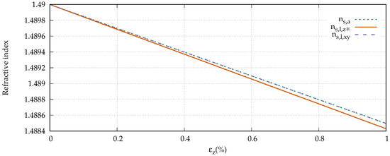 Waxler et al. experimentally determined the photoelastic constants of PMMA, and found , and [26]. With an initial refractive index of the core of , we derive the refractive indices for the strained fiber according to Equation (12). Figure 4 shows the development of the refractive indices for the axial direction and both lateral refractive indices up to a strain of 1%. It can be seen that the change is similarly small (≈0.1%) in all three cases. In fact, an axial ray encounters the same refractive index as a lateral ray which is polarized in the plane.