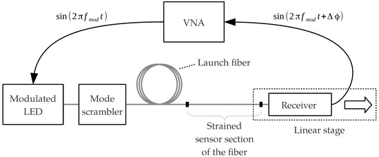 The sensor section of the fiber was glued into aluminum mounts at the boundaries. While the first mount had a fixed position during the measurement, the second mount at the end of the fiber was attached to a computer-controlled high-precision linear stage with which the axial strain was applied. In order to avoid possible slipping of the fiber in the jacket, bare fibers were used for the measurements. The receiver was placed on the linear stage after the second mount and converted the optical power into an electrical voltage. Apart from a low-impedance amplification included in the receiver, no further signal processing was required and the electrical voltage was directly returned to the VNA. Finally, the VNA was used to determine the phase difference between the transmitted and the received signal. By monitoring this phase difference, we could observe the the impact of strain on the modulation phase.