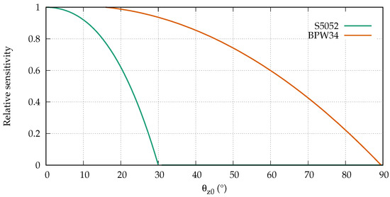 As mentioned previously, effects such as modal dispersion and scattering affect the development of the modulation phase along an SI-POF. However, the level of influence is affected by the angular acceptance range of the applied receiver. Therefore, we considered two different receivers, both silicon PIN photodiodes, which were used in the simulations and in the measurements. The first was an S5052 [28] from Hamamatsu with a relatively narrow angular sensitivity. The second was a BPW34 [29] from Vishay, which accepts larger angles. The angular sensitivities of both photodiodes taken from the data sheets are depicted in Figure 6, where is the propagation angle between a ray and the optical axis outside the fiber.