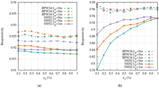 The simulations were repeated, neglecting the angular dependency of the refractive index. The refractive index was set to , independent of the angle . The resulting responsivities barely differed from the depicted values with the angle-dependent refractive index. In fact, the deviation was so small that the responsivities could not be distinguished in the depiction and are therefore not presented.