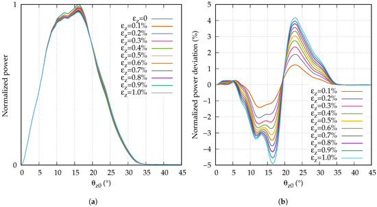 Seeking a possible explanation for the observed results, we measured the far field at the end of the fiber under different strain conditions. The length of the launch fiber was , and Figure 8a shows the angular power distribution of the far fields normalized to a maximum power of 1. While it can be seen that the peak power decreased with the strain, the changes were too small to be well observable in this representation. Therefore, Figure 8b shows the normalized power deviation of each strain step compared to the far field of the unstrained fiber. The power deviations were normalized to the maximum normalized power level (1). Several conclusions can be drawn from Figure 8b. When the fiber was strained, a part of the power in the range of 5 to 18 was shifted towards the range of 18 to 35. The stronger the strain, the larger the shifted power. However, the increase of the shifted power per strain step decreased with the strain.