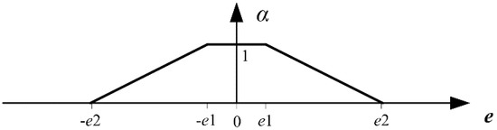 According to the control precision requirements of AUV, two boundary values of depth error, e1 and e2, are determined, and e2 > e1 > 0. e denotes the current error of depth. When the error is large, i.e., ||e|| ≥ e2, in order to improve the response speed of the system, it is necessary to reduce the weight of control increment vector. In this case, α is set as 0. When the error is small, i.e., ||e|| ≤ e1, in order to avoid fluctuations that are caused by quick changes of input in the steady state, it needs to increase the weight of control increment vector. In this case α is set as 1. In order to obtain a smooth transition for α from α = 0 to α = 1, when e1 < ||e|| < e2, a linear function is used to determine the value of α shown as Figure 1, and the adjustment equation of α is shown as Equation (11).
