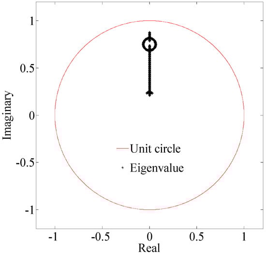 According to [34,35], if all the eigenvalues of the matrix A − BKmpc(Sx + IcC) are in the unit circle in the complex plane, the system is asymptotically stable. A, B, C used in this paper are described in Section 5.2, determined according to the dynamic model of the experimental AUV.