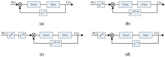Evolution of autonomous underwater vehicle (AUVs) control system block diagram in this paper. (a) AUVs’ block diagram; (b) block diagram after separating the lag component and moving the summing junction past the e−βs block; (c) block diagram after introducing e−βs component between R(s) and the summing junction; and, (d) final block diagram after introducing e−βs component.
