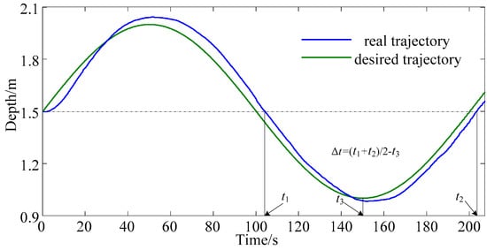 Parameter N is calculated by N = Δt/Tc, where Δt is the lag time between the desired trajectory and the experimental output curve, shown in Figure 4, Δt = (t1 + t2)/2 − t3. In Figure 4, t1 and t2 is the time when the depth of the AUV reaches the equilibrium position of desired sinusoidal trajectory, and t3 is the peak time of desired sinusoidal trajectory.