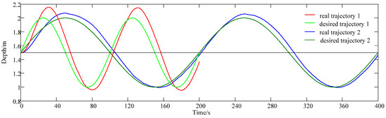 Experiments are conducted to obtain Δt and N. First, the AUV is fixed at 1.5 m and then tracks a sinusoidal trajectory. Δt is measured by the experimental data, and N is calculated by N = Δt/Tc. It is found from experiments that when tracking different frequency sinusoidal trajectories, the difference in the lag time is not large. Take tracking the sinusoidal trajectory with periods of 100 s and 200 s as an example, as shown in Figure 5, where the period of trajectory 1 is 100 s and the period of trajectory 2 is 200 s. The average Δt of tracking the sinusoidal trajectory with periods of 100 s is 4.972 s, and the average Δt of tracking the sinusoidal trajectory with periods of 200 s is 5.056 s.