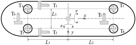 UVIC-I AUV is equipped with eight thrusters, two to actuate surge, two to actuate sway and yaw, and four vertical thrusters to actuate heave, roll, and pitch, as shown in Figure 7, where L1 = 0.75 m, L2 = 0.85 m, L3 = 0.27 m [27]. A depth sensor, with an accuracy of 0.003 m, is installed on UVIC-I AUV for depth measurement, and the heave speed is obtained by depth sensor data differential. The depth and speed data are recorded on the UVIC-I AUV onboard memory for each control cycle. The data is read and analyzed offline.
