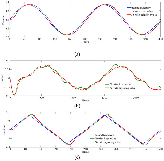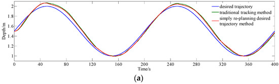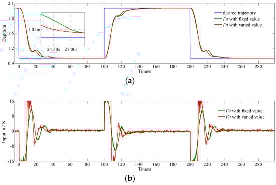 When the error is large, the curve of input u in Figure 8b shows that MPC with real-time adjusting Γu can change the input more rapidly than MPC with fixed Γu to improve the response when the error is large. This is due to the fact that fixed Γu set as Im×m results in that the control increment vector is too conservative during the settling stage. When the error is small, both the MPC with varied Γu and the MPC with fixed Γu have a good depth keep characteristic. This is due to varied Γu is set as Im×m by Equation (11), which causes the controller to perform conservatively to maintain the characteristics of reducing output disturbances and fluctuations on the steady stage.