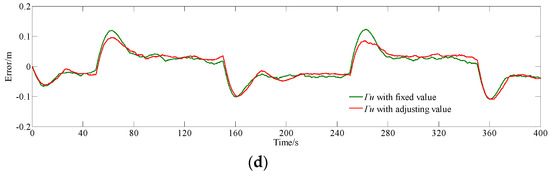 From Figure 9b,d, it can be seen that the maximum of absolute error of adjusting Γu MPC (with error intervals of [−0.097 m, 0.078 m] and [−0.109 m, 0.095 m]) is smaller than fixed Γu MPC (with error intervals of [−0.098 m, 0.075 m] and [−0.109 m, 0.123 m]), and except for areas near the peak of absolute error, the error curves are similar to those that are based on MPC with fixed Γu and adjusting Γu.