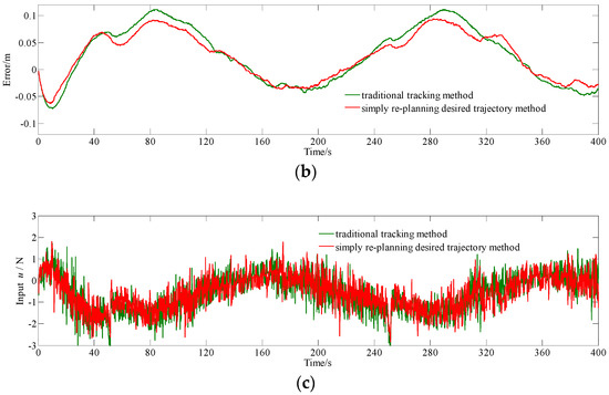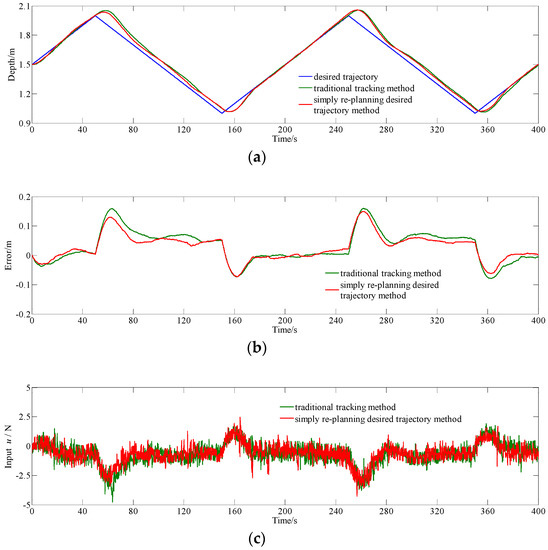 Comparative experiment results for simply re-planning the desired trajectory method and conventional tracking method with MPC tracking sinusoidal trajectory. (a) Depth data; (b) error data; and, (c) input u.