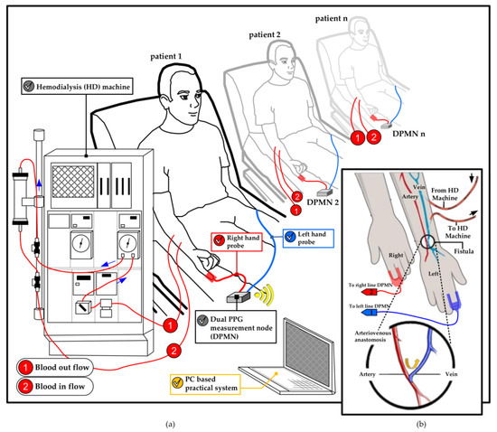 Dual optical PPG measurement technique: (a) PC Base practical PPG measurement with DPMN; (b) PPG probe placement and the fistula.