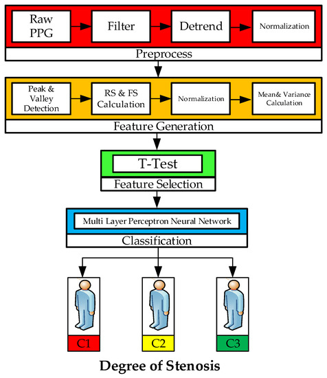 The main techniques of this study which are depicted in Figure 2 are outlined in four stages: (a) preprocessing of dual PPG signal, (b) feature generation (peak and valley detection, rising and falling slope calculation, normalization, mean and variance calculation), (c) feature selection (Statistical hypothesis T-test has been used for selecting the neural network input), (d) classification by utilizing MLP neural network to classify the input based on degrees of stenosis.