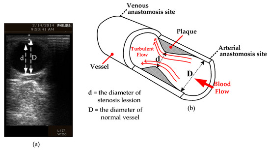 (a) B-mode ultrasound image of DOS measurement area; (b) the cross-section of the vascular access: the stenosis lesion diameter d and normal vessel diameter D [14].