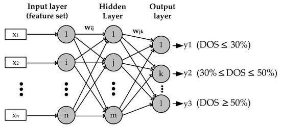 The input, hidden and output layer expressed in the index of neurons i, j and k respectively. The calculation of neurons in MLP is formulated in Equation (8), where r is the number of input data features, while x (x1, x2, …, xn) represents the feature value and w is the weight of the vector. In this study, the number of input data features r = 4, is taken from the variance and the mean value which is the selected feature by the T-test. The weights for connection from the input layer to the hidden layer are expressed in wij while the weights from the hidden layer to the k neuron in the output layer are expressed in wjk (8) [27].