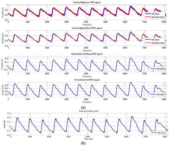 (a) The process data preprocessing; (b) Final result of peak and valley detection on selected twelve peak PPG signals.