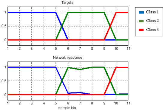 In the above table, it can also be concluded that the MLP model with the parameters used can classify the input data in accordance with the desired target classes that is, 5 target outputs of class 1, 4 of class 2 and 2 of class 3, respectively. Figure 8 illustrates the response of the network related to the class target to prove how well the MLP model is. Training curve is a curve that displays MSE versus iteration (Epoch).