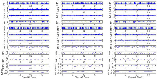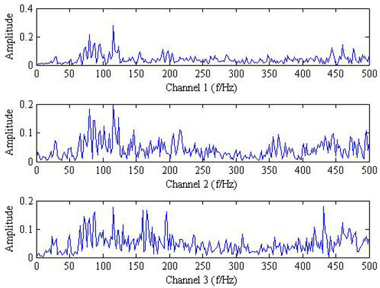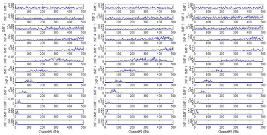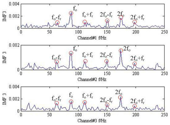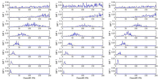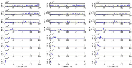 As shown in Figure 1 and Figure 2, it is hard to identify the frequency characteristics and modulation phenomenon of the observed trivariate signals with noisy. Only the inner race fault frequency in channel#3 can be inspected, and other frequency components are not obvious for all the channels. It is illustrated that the influence of noise should not be neglected and more advanced methods are required. Then, the conventional MEMD methods are employed to deal with the simulation signal and the result is plotted in Figure 3. From the analysis result of the three channels shown in Figure 3, it is proved that MEMD has advantages in guaranteeing the stability of the decomposition results. However, the characteristic frequencies , and the frequency modulation still cannot be identified.