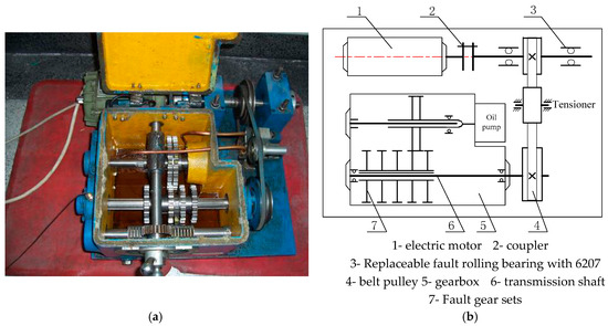 Fault experimental table of roll bearing. (a) The physical map of test rig; (b) The structure diagram of test rig.