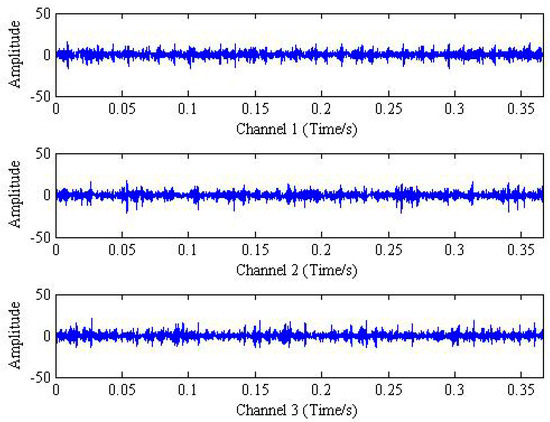 In the analog process of sensor collecting signal, the vibration signal will be collected by any sensor simultaneously, and the trivariate signal is the instantaneous mixed signal composed by three above mentioned simulation signal. Considering the influence of noise, the zero-mean additive white Gaussian noise with variance 0.5 is added to the observation signal, and it is denoted as . A random matrix of 3 × 3 is chosen to mix the simulation source signal together and it can be expressed as follows: