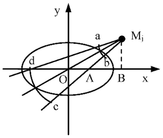 In this way, the information utility of the sensed module Mj in node Ni can be approximated as the intersecting area of the sight lines of the sensed module and the ellipse, as shown in Figure 4, where the angle of sight lines of sensed module Mj is . The smaller the area is, the more information is provided by the sensed module, and the less state uncertainty of the target is obtained. The equation of the uncertainty ellipse is described as: