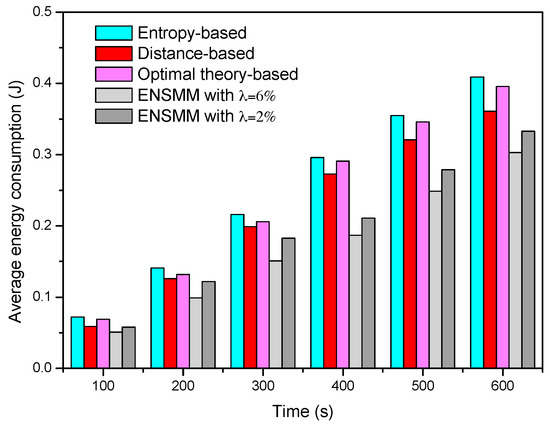 Figure 6 shows the average energy consumption of each node in surveillance stage under different node management algorithms. We can see that the average energy consumption in ENSMM is lower than that in the other methods. This is because, ENSMM carries out the power management on the sensed modules of each node, and some of sensed modules which have high power consumptions are turned off when no target appears in the deployed area. In addition, the smaller the detected error probability is, the more nodes and sensed modules are required to work, so that the average energy consumption when λ = 2% is higher than that in λ = 6%. Compared with ENSMM, as all the sensed modules are active when the node is work, the other three methods have higher energy consumption. In the entropy-based method, due to a great deal of calculation on mutual information, it has the highest energy consumption. The optimal theory-based method reduces the computational complexity so as to have lower energy consumption. Nevertheless, the distance-based method has the simplest computation and small computational burden so as to have lower energy consumption than the entropy-based and optimal theory-based method.