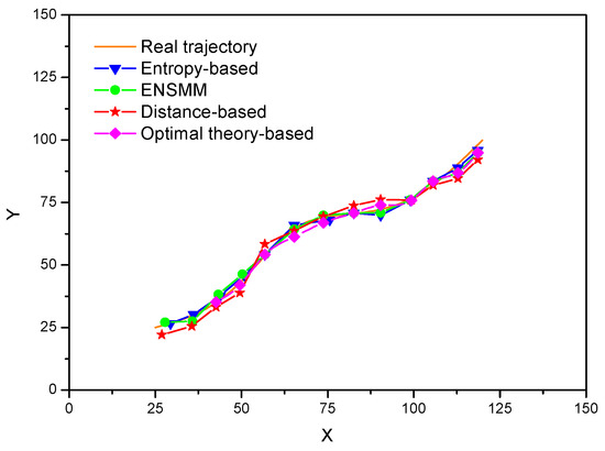 In Figure 7, tracking a target with sensor nodes under the energy constraint is illustrated. Both the true target trajectory and estimated target trajectory are plotted when all the nodes send their measurements to the sink. It is observed that the proposed ENSMM shows similar performance as that of the entropy-based method. This is because the nodes and their sensed modules which can bring the maximum increment of the information utility are selected to meet the tracking accuracy. For the distance-based method, the nodes near to the target are selected by the sink with probability, and without considering the information utility and the correlation of the observations of the nodes, thus the estimated target trajectory has bigger differences with the real trajectory and it is expected to give worse tracking performance compared to the other node management methods.