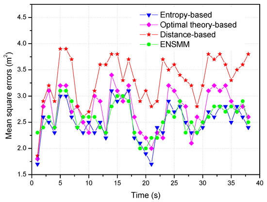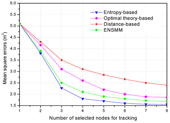 In Figure 8, we show the tracking performance for different node management methods when 3 nodes are selected for tracking. From Figure 8, we can see that ENSMM and the entropy-based method can almost obtain the same performance on the mean square positioning errors. This is because, ENSMM adopts the joint weighted information utility measurement considering the spatial correlation of nodes and their sensed modules, and then it has better chance to activate even more informative nodes and sensed modules for tracking. Likewise, since the entropy-based method executes a lot of probability predictions and intensive entropy calculations to select the appropriate nodes for tracking, so that it has the most accurate results. The optimal theory-based method has less positioning accuracy than ENSMM and entropy-based method because it selects one node each time just to optimize one of the parameters without considering the correlations among the observations of the nodes. For the distance-based method, since it just chooses the nearest sensor nodes from the target to execute the tracking tasks without considering the moving trend of the target and the effect of the angular diversities of sensor nodes, so that it obtains the least positioning accuracy.