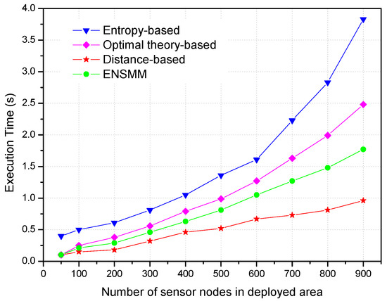 Comparison of execution time versus the number of nodes in deployed area.