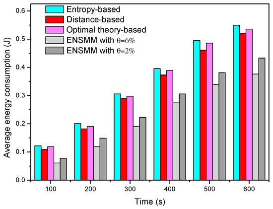 Figure 12 shows the average energy consumption of each node in tracking stage under different node management algorithms. We can see that the average energy consumption is the highest in the entropy-based method. This is because it has the highest computational complexity and when a node is in work status all its sensed modules are active. Although the distance-based and optimal theory-based methods have lower computational complexity, they have not yet managed sleep/work status for sensed modules, so that they also have higher energy consumption. In contrast, the advantages of the proposed ENSMM are even more obvious and the average energy consumption in ENSMM is lower than that in the other methods in the tracking stage. We see that ENSMM can conserve at least 16% and 21% energy than that in distance-based and entropy-based approaches in tracking stage. This is because, ENSMM carries out the power management on the sensed modules of each node, and then not only the sleeping sensed modules can save energy but also the sleeping modules do not transmit sensed data in the network, which will reduce the number of the transmission data and further save energy.