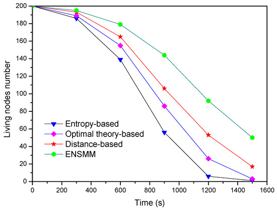 Finally, Figure 13 shows the living node number changes with the simulation time under the different methods. We can see ENSMM has the most living nodes number among these approaches at each time step and the network lifespan in ENSMM is also extended. The main reasons are as following: (1) ENSMM has efficient power management for the nodes and the corresponding sensed modules, so that the idle nodes or sensed modules can be in sleep status to save energy; (2) It has relative less computational complexity. Meanwhile it balances the energy consumption in the network by executing the energy intensive sensory tasks on the nodes which have more residual energy; (3) It reduces the number of the transmitted data by turning off the active sensed modules.