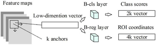 An RPN takes an image as input and outputs candidate regions. To extract candidate regions, a sliding window (typically 3 × 3) is slid over the feature map output by the last shared convolutional layer. Each sliding window position produces a low-dimensional vector from which candidate regions with different sizes and aspect ratios can be generated. Afterward, the vector feature is fed into two fully-connected sibling layers. These are the box-classification layer (b-cls layer) and the box-regression layer (b-reg layer). The b-cls layer estimates whether the candidate regions contain the objects and the b-reg layer adjusts location information. The number of candidate regions for each location is denoted as k. Therefore, the b-cls layer outputs 2k scores and the b-reg layer has 4k outputs encoding the coordinates of k locations. The network structure is shown in Figure 1.