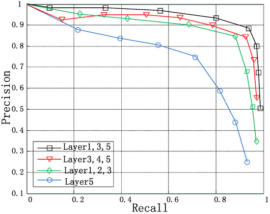 To explore the influence of fusing the feature maps of different layers on the detection result, we used the same training method to perform multiple sets of comparison experiments. We fused layers 1, 2, and 3 in one experiment; layers 3, 4, and 5 in another; and layers 1, 3, and 5 in a final experiment. To ensure the selection of the first 300 extracted regions from each training image, we calculated the accuracy and recall rate. The experiment results are shown in Table 2. To intuitively demonstrate the performance of different fusion methods, precision-recall (P-R) curves are shown in Figure 5.