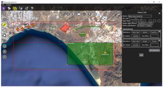 In order to permit the operators to create new missions and fulfill them with all the elements involved in the mission (tasks, vehicles, GCSs, etc.), a mission designer has been developed (see Figure 2). The integration of these new functionalities into QGroundControl requires the modification of this software in order to extend its functionality. For this, a new tab has been added in the main menu of the QGroundControl (represented in Figure 2 with a looped path in the top bar). This tab is used both for the mission designer and the rest of functionalities added in the following sections.