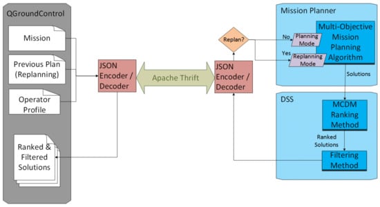 For all this process, since the mission is provided until the ranked and filtered solutions are returned, a test bed interface has been designed. The communication interface between QGroundControl and the planning and decision algorithms has been implemented using Apache Thrift (https://thrift.apache.org/). This frameworks permits an easy communication with most known programming languages. The interface sends the mission and the operator profile extracted from QGroundControl as a JSON message. This message includes the different parameters of each element of the mission explained in Section 3. On the other hand, the message returned by the algorithm must contain a ranked list of solutions, where each solution defines the assignments for each task, including the flight profile and sensors used; the GCS assignment, final path and performance variables (fuel consumption, flight time, etc.) for each UAV and the values of the optimization objectives and risk factors of the problem. The architecture of these modules is represented in Figure 4.